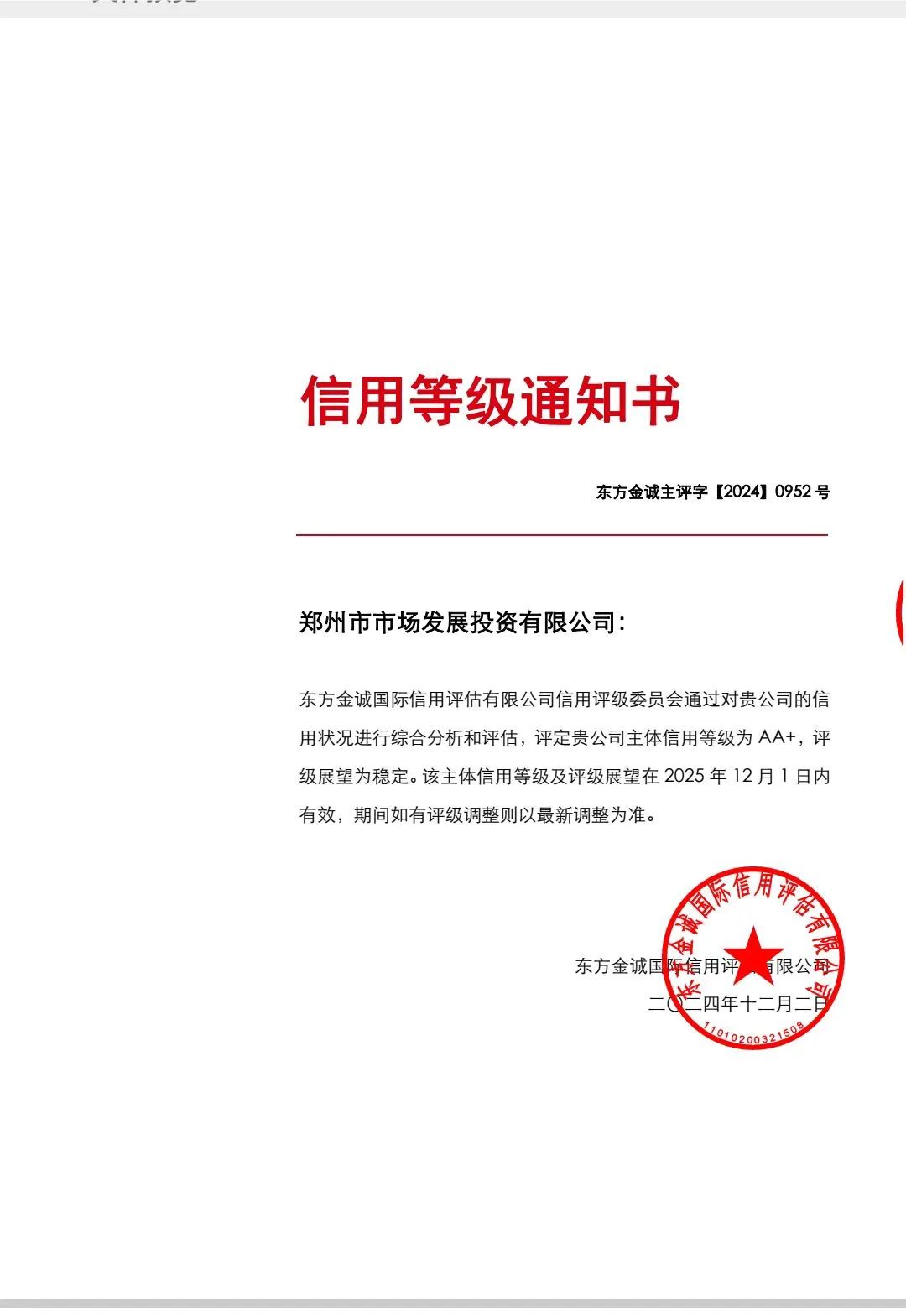 鄭州市市場(chǎng)發(fā)展投資有限公司再獲AA+主體信用評(píng)級(jí)